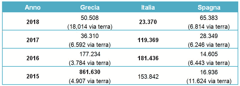Di seguito una tabella recante flussi migratori degli ultimi anni (2014-2018) verso i principali Stati membri che si affacciano sul Mediterraneo (Dati UNHCR):