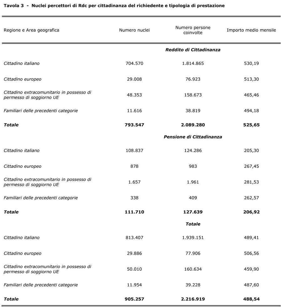 Delle 905 mila domande accolte, 793 mila riguardano nuclei percettori del Reddito di Cittadinanza, con 2,1 milioni di persone coinvolte, e le restanti 112 mila sono nuclei percettori di Pensione di Cittadinanza, con 128 mila persone coinvolte (vedi Tavola 2). La percentuale di composizione tra le due prestazioni erogate varia in virtù della zona geografica: i nuclei percettori di Reddito di Cittadinanza passano dal 90% nelle regioni del Sud e delle Isole, all’85% nelle regioni del Centro per poi diminuire ulteriormente di un punto percentuale nelle regioni del Nord.