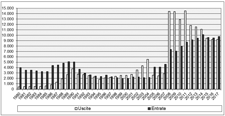 Figura 1. Rimesse dall’Italia e verso l’Italia in milioni di dollari. Anni 1980-2017