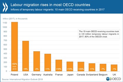 Secondo i dati statistici preliminari, nel 2018 i Paesi dell'OCSE hanno accolto circa 5,3 milioni di nuovi migranti permanenti, un aumento del 2% rispetto al 2017. Dal 2015 i Paesi europei dell'OCSE hanno accolto complessivamente un maggior numero di migranti permanenti rispetto agli Stati Uniti. Gli Stati Uniti restano nondimeno il singolo Paese più importante di destinazione per i migranti, seguiti dalla Germania.
